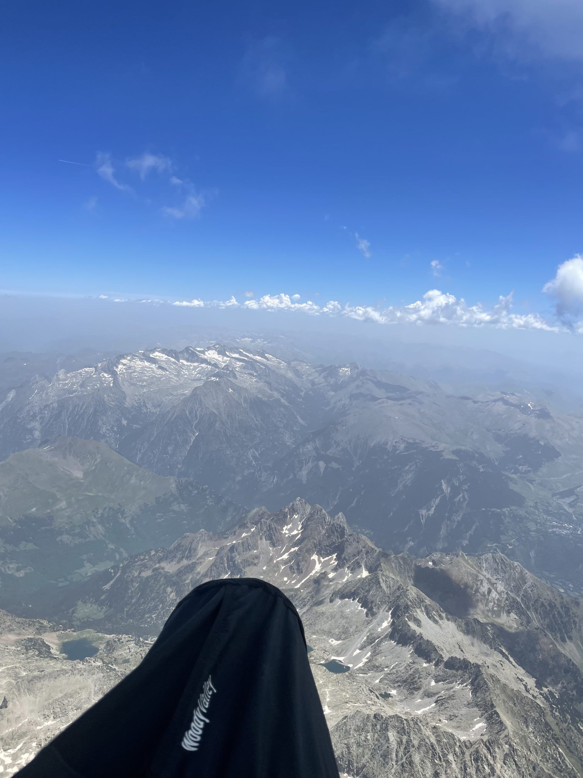 Aquí ha habido 40 grados, lo que significa alcanzar grandes alturas que nos permiten cruzar la cresta principal de los Pirineos con facilidad. El patrón principal, por la mañana es estable en Francia, con mucho calor y poco movimiento, luego ¡Bam! Se pone en marcha y volamos tan rápido como podemos subiendo a más de 7 m/s sin problemas hasta que las nubes se vuelven oscuras y se desarrollan. Estas calurosas caminatas matutinas y algunas carreras calientes nos han ayudado a adaptarnos. Esperamos un gran cambio de tiempo y veremos cómo cambia nuestro ritmo esta semana.