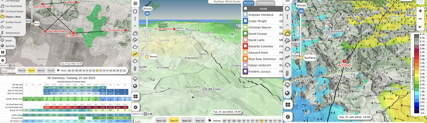 La parte francesa de la zona comprendida entre TP2 y el Valle de Aure (alrededor del Pic du Midi) parece muy complicada, con dos masas de aire apiladas: la masa de aire francesa inferior, cubierta y relativamente estable, con vientos del noreste hasta unos 1500 MASL, y la masa de aire superior, con mejores térmicas pero condiciones ventosas debidas al viento del sur.