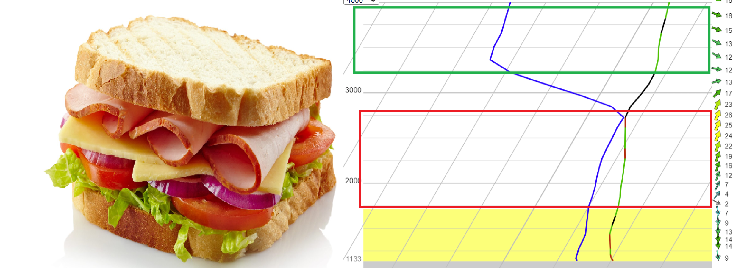 La capa estable más baja en amarillo, la capa media con vientos del sur enmarcada en rojo y la capa enmarcada en verde con vientos del norte por encima de 3000 MASL.