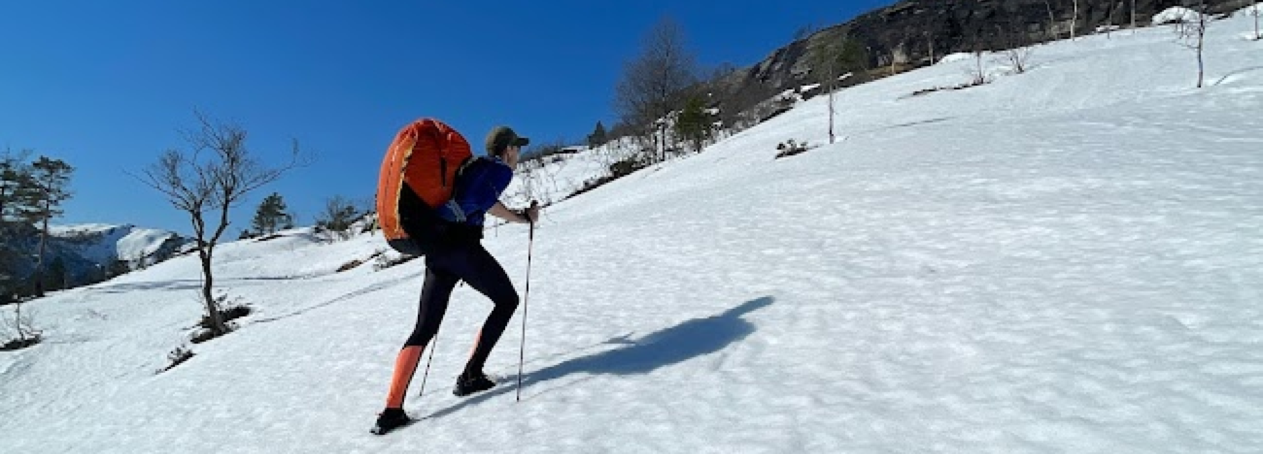 El aire era relativamente estable, con térmicas hasta un máximo de 1200 m de altitud, y los vientos del NE hicieron que el vuelo fuera un reto. Además, el hecho de que el fiordo de Mo tenga pocas o ninguna opción de aterrizaje hizo que el vuelo fuera interesante. Después de 10-12 km sin aterrizajes, llegó el momento de dirigirse al norte, a Romardalen. Un valle estrecho con terreno ascendente. Todo estaba cubierto de nieve desde el fondo del valle y hacia arriba. No había actividad térmica y las condiciones eran de sotavento. El vuelo terminó aquí, en un aparcamiento junto a la carretera principal. De todos modos, aún lejos de mis esperanzas para el día, aterricé con la misma sensación que el día anterior. Hasta cierto punto satisfecho. Aunque las condiciones eran difíciles, conseguimos dar un giro a nuestra mentalidad y aprovecharlas.