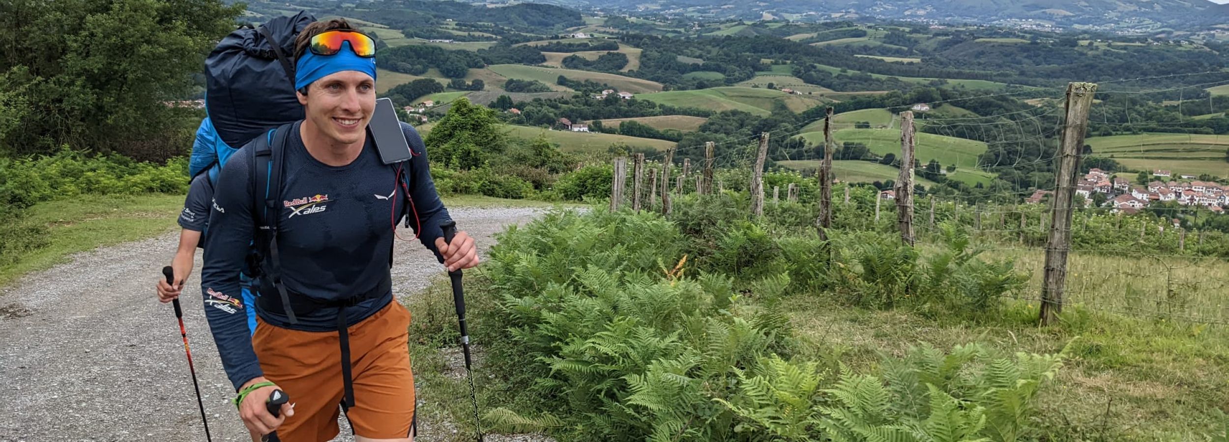 Como el tiempo no era tan malo como se esperaba, nuestro equipo tuvo un buen comienzo. Simon consiguió mantener un ritmo constante en la subida a La Rhune y bajó planeando hacia el lado noreste. En este momento está subiendo una pequeña montaña llamada Errebi para realizar otro vuelo. (Foto) Esperamos que esta ruta con algo de senderismo y vuelo sea el camino más rápido hacia la segunda baliza Accous.