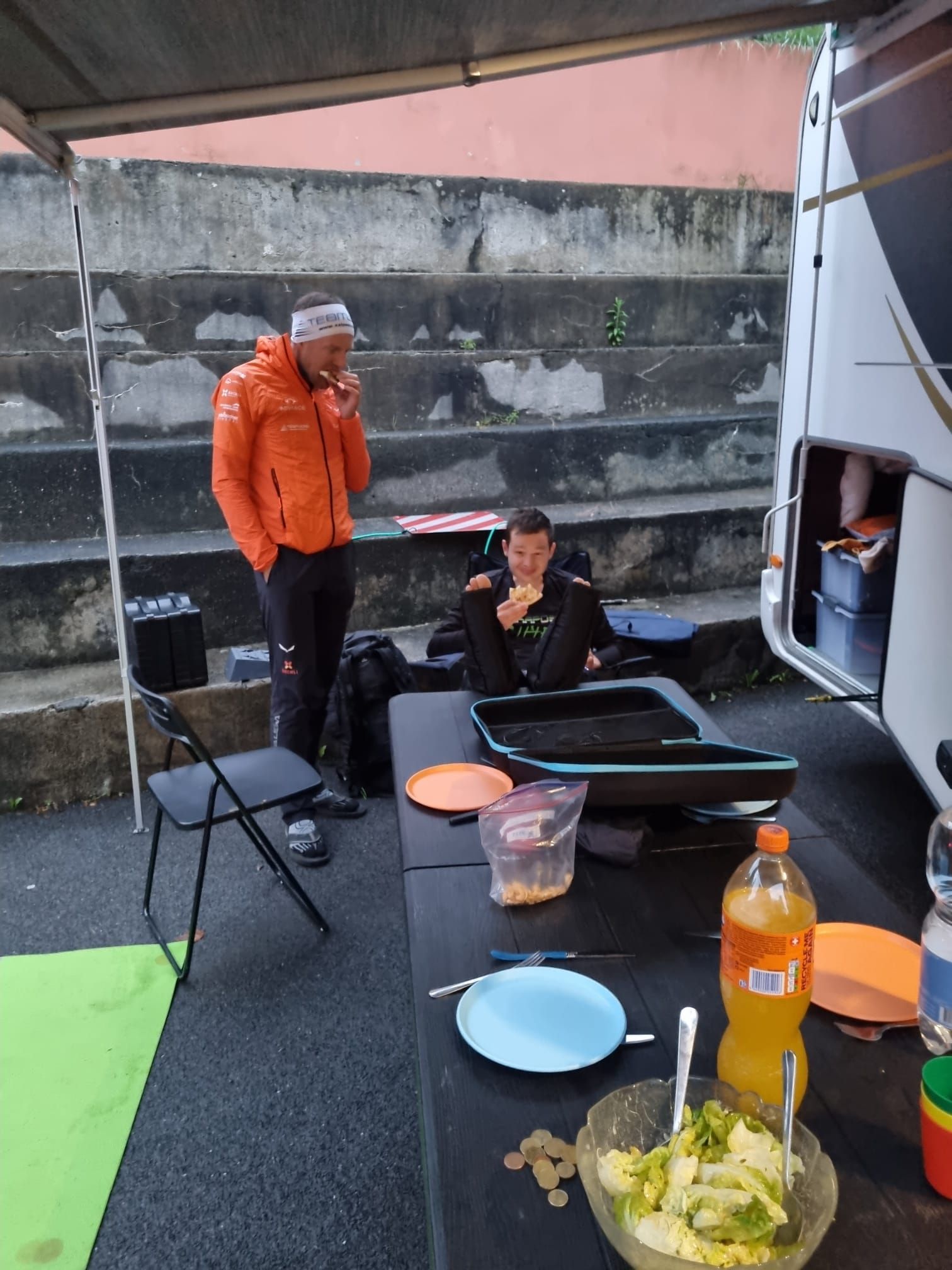 Finalmente, de vuelta al fondo del valle, las nubes bajaron al suelo y llovió constantemente. Inhalamos algo de comida y luego hicimos una última carrera de 10 km hasta nuestra base para pasar la noche.