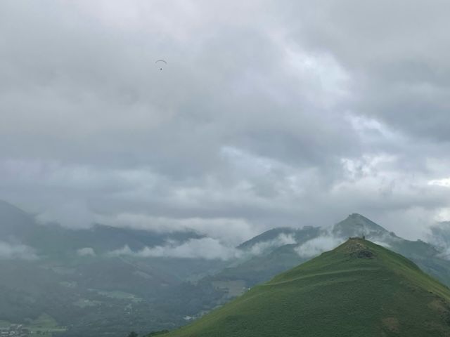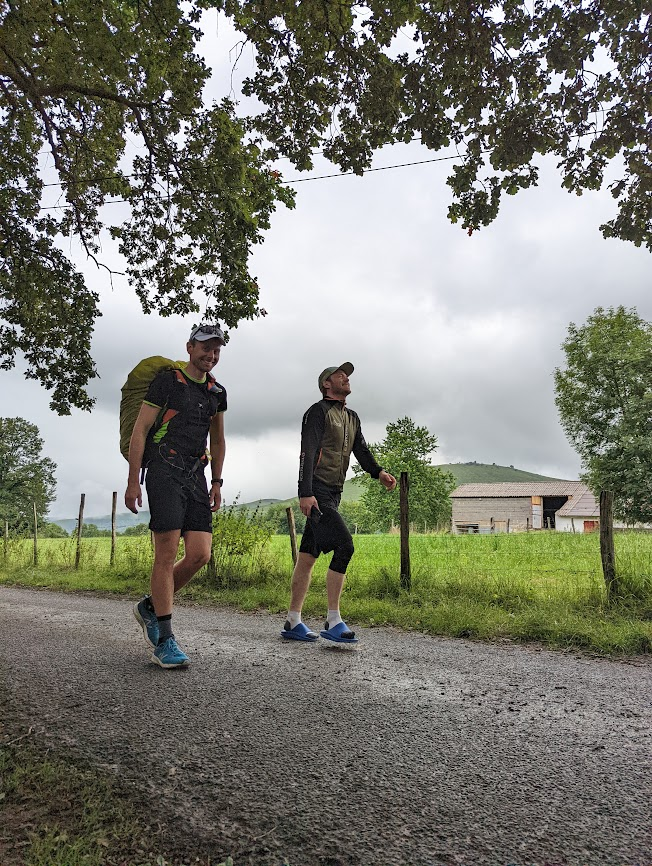 Así que ahora tenía que mantener el ritmo sobre el terreno durante otros 15 km con la lluvia persiguiéndome por detrás. El objetivo era volar una vez más antes de que llegara la lluvia. Pero al llegar a la siguiente cumbre teníamos nubes bajas, lluvia y vientos de espalda. Tuvimos que volver a bajar a pie. No es bueno para mi rodilla, ni para la moral. Las condiciones del camino de bajada eran tan malas, con barro resbaladizo y lluvia intensa, que mi asistente y yo tuvimos que reírnos de la situación.