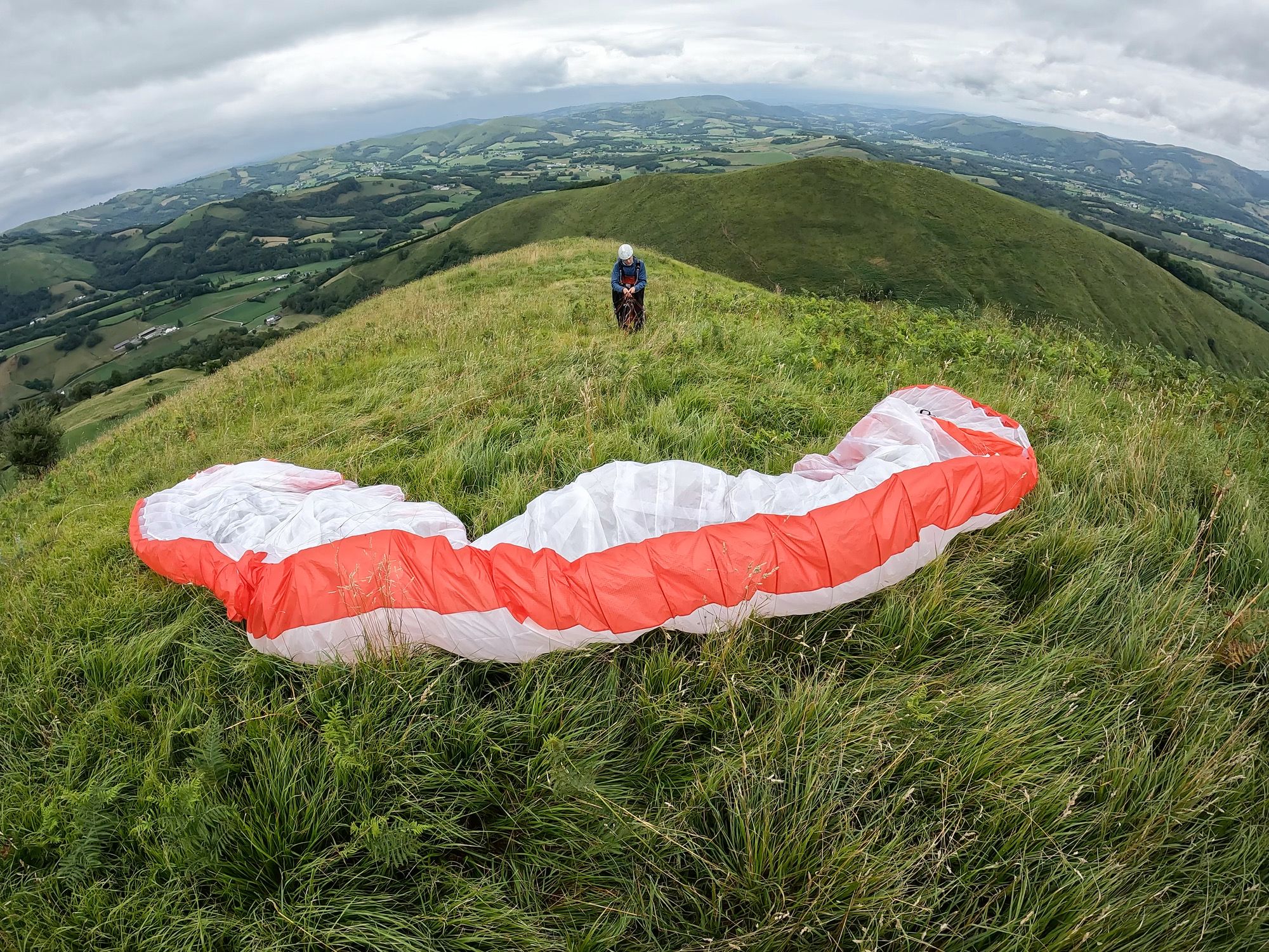 Ya en la primera cima del día nos sorprendieron las nubes con lluvia. Caminamos más hacia el este y finalmente pude despegar y bajar volando. Lo único es que ahora estábamos demasiado al este y fuera de la ruta. Subí una nueva colina y pude lanzar lo suficientemente alto como para dar la vuelta por el lado correcto y volver a la ruta. Así que pensé…