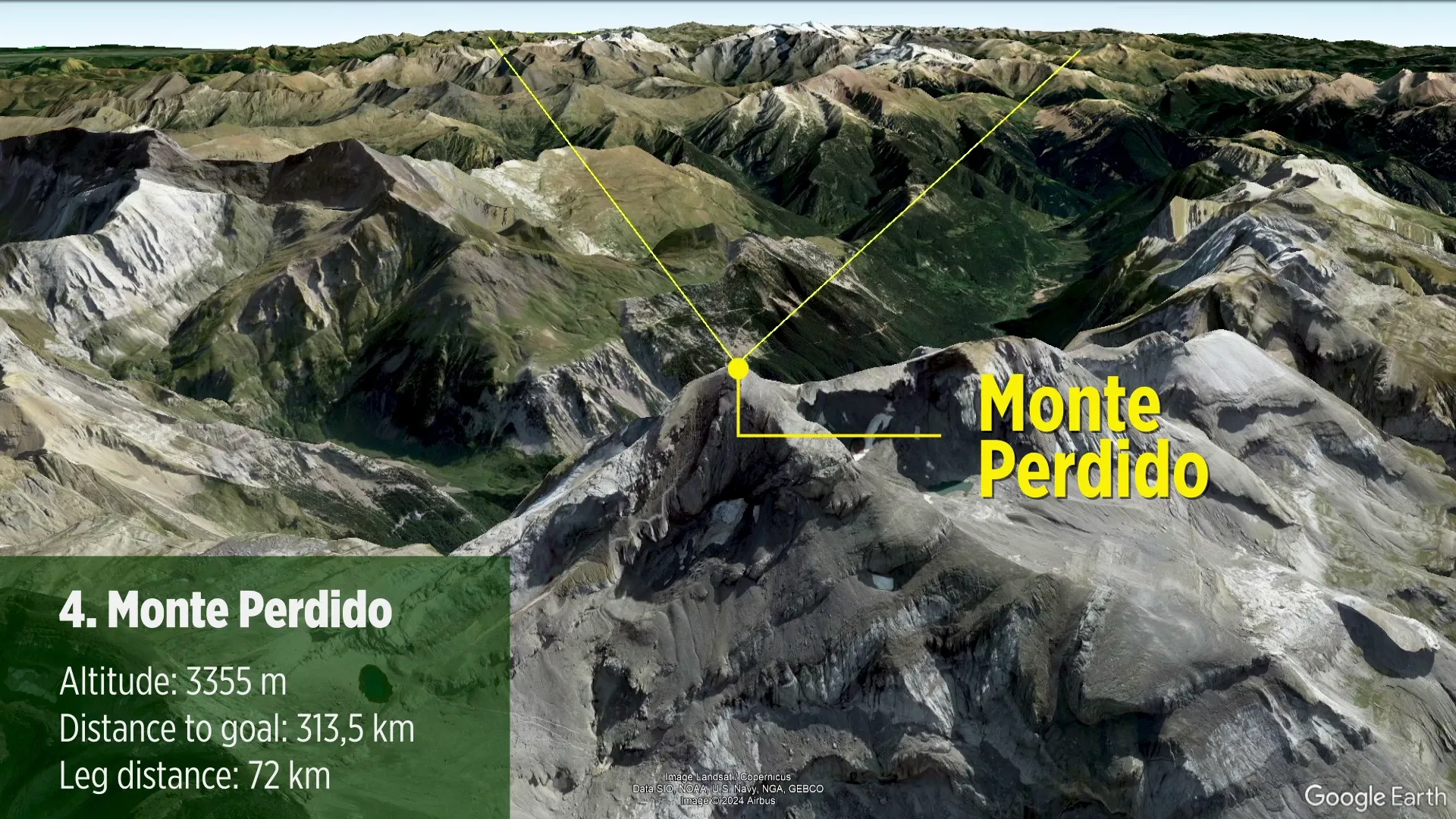 | 4 Monte Perdido | 3355 m | 33000 m | 26.9 km | 143.7 km | 256.4 km | 230.6 km |
