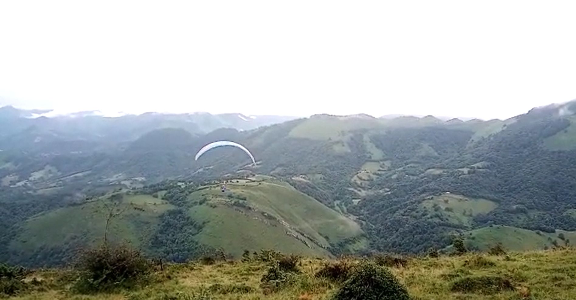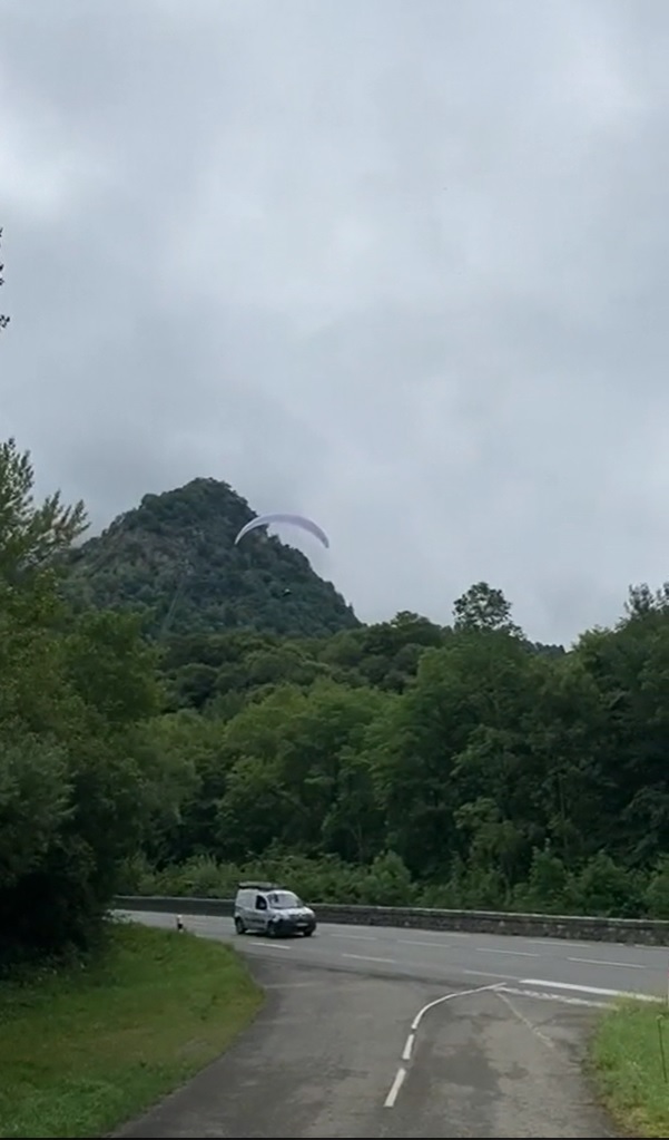 The start in the day was not the most pleasent thing. We slept in, to give my feet and knee a little more rest. Then, a climb through thick fog and a wet forest allowed the limbs to warm up a bit. We found a take-off which was just below cloudbase and allowed a flight in to the LZ of Accous. After a break to discuss strategy, I decided to take the route through the high mountains. Walking uphill works great, but flats and downhill are killing my foot-ligaments, so it was the obvious choice. A nice hike of 1800m allowed to reach the sun above the clouds and take off at Col Lardi. Conditions were on, so i could fly just to the entrance of the tunnel to Canfranc. There I teamed up with Cedar Wright, and we had a blast to reach the take-off above Canfranc.